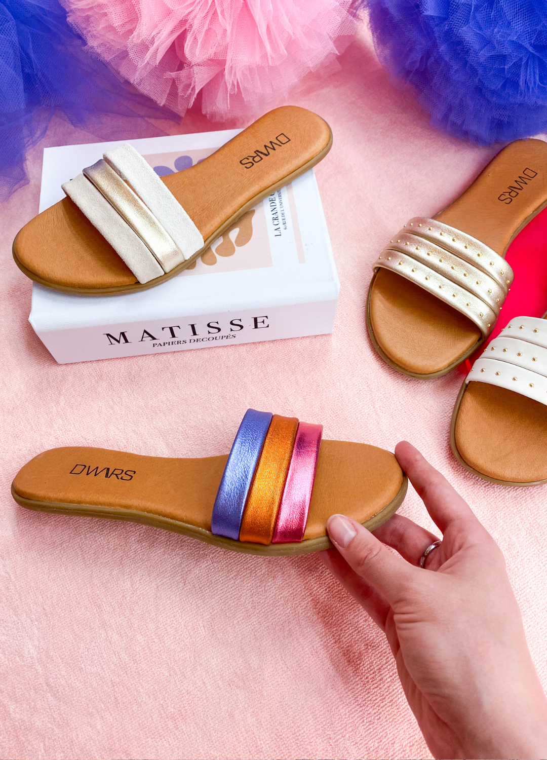 Met deze HANA slippers ben jij helemaal klaar voor het nieuwe seizoen. De slippers hebben drie bandjes op de wreef en zijn gemaakt van metallic. De binnenzool is gemaakt van leer waardoor het een comfortabel voetbed heeft.MAATADVIES