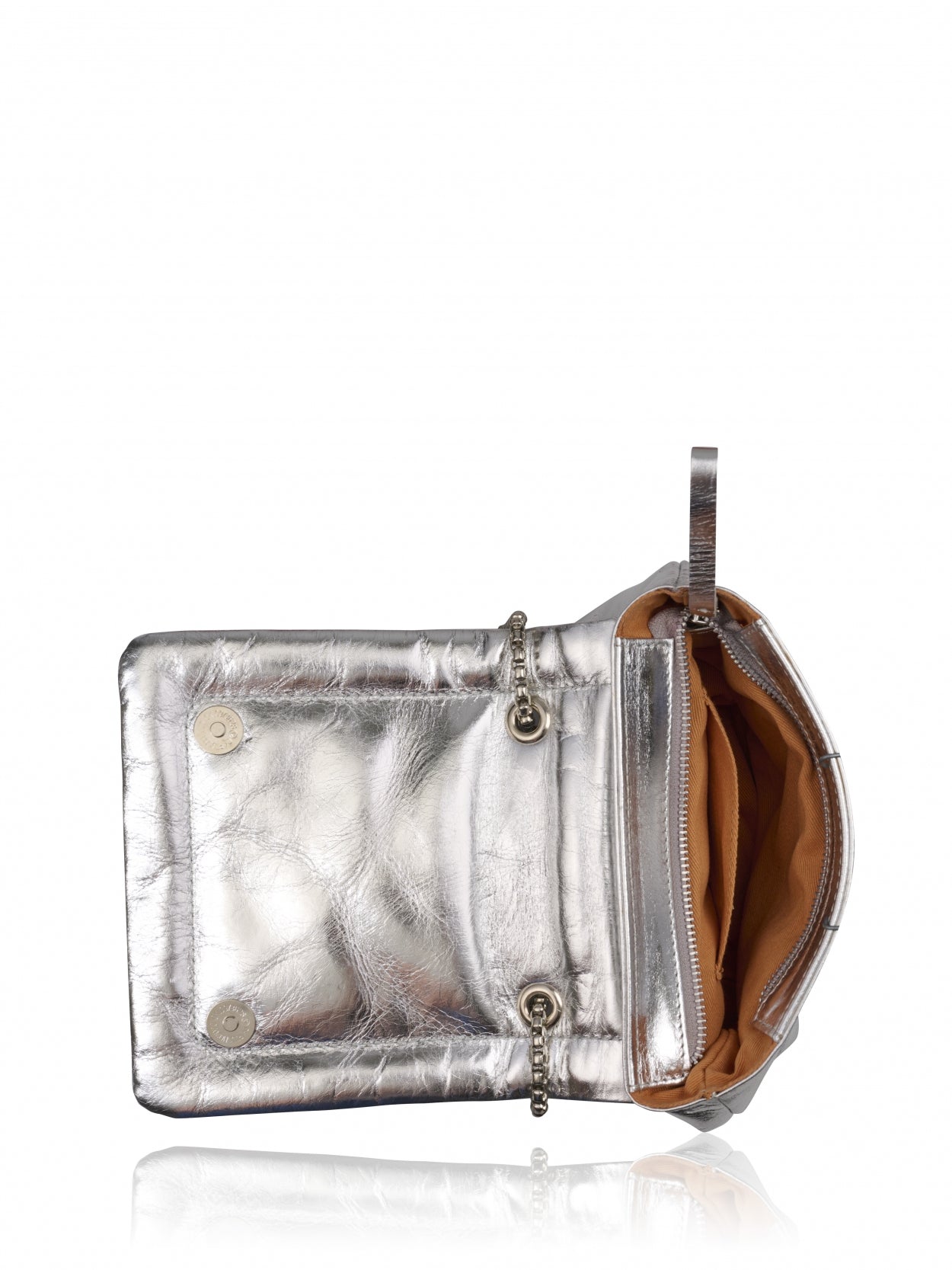 De Spezia zilveren tas is een echte eyecatcher om jouw look compleet te maken. Style de Spezia bag met 1 van je metallic sneakers of loafer voor een trendy look. De tas heeft drukker en een ritssluiting. Door het exclusieve design van de tas met gouden ketting kun je de metallic tas zowel kort als lang dragen.Hoogte: 14 CM