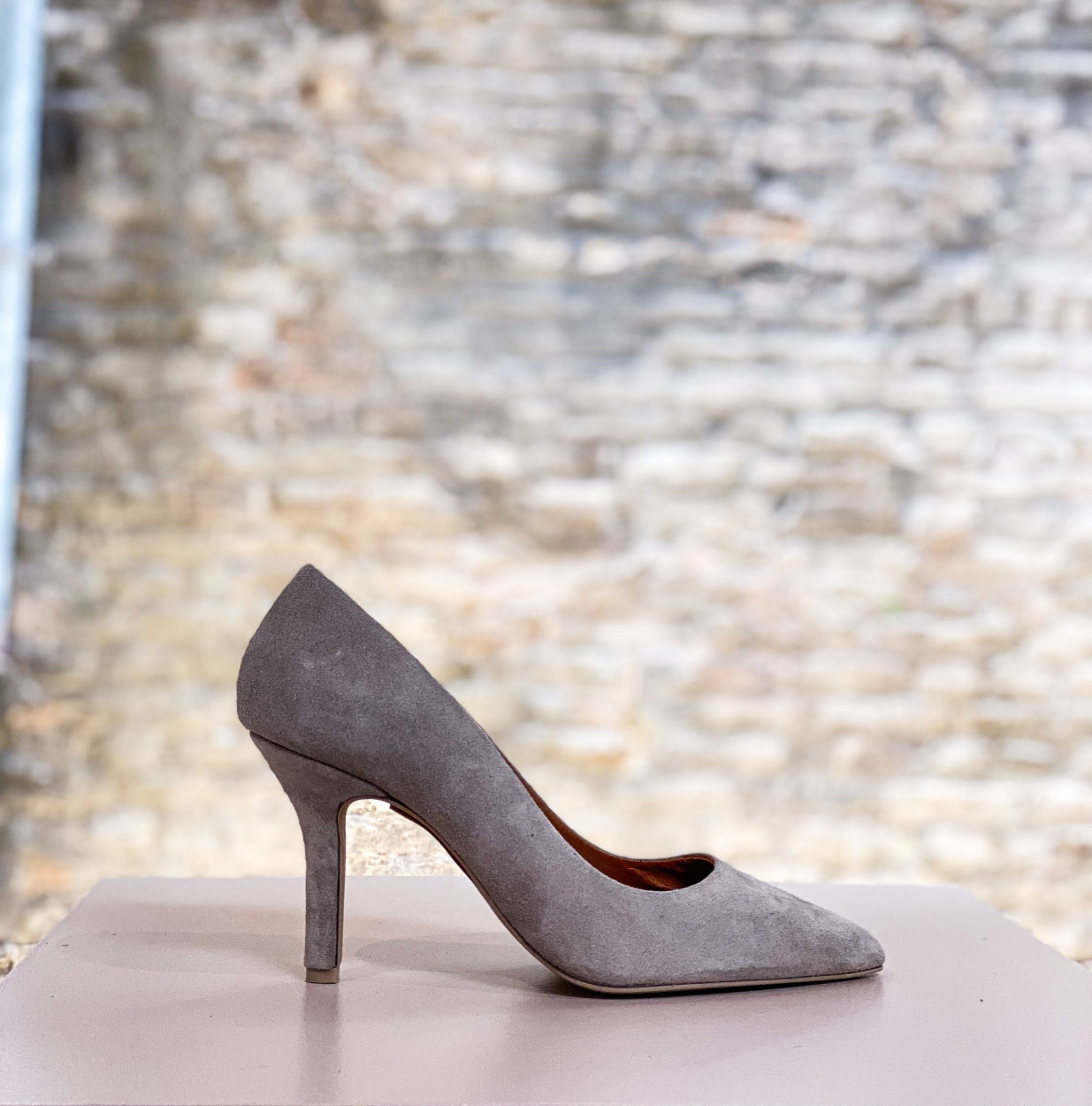 Suede lichtgrijze pump met punt neus